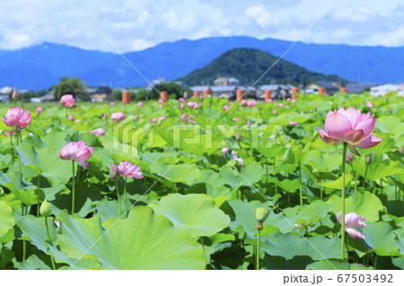 奈良県橿原市 盛夏の藤原宮跡 畝傍山をバックに咲く蓮の花
