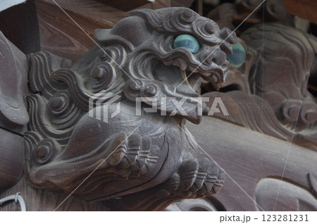 信州 松本の寺院 兎川寺 本堂向拝の獅子の彫刻 立川流藤森廣八の作品