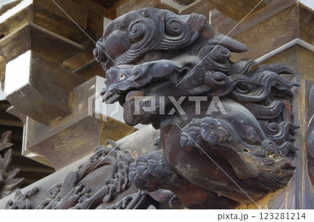 信州 松本の寺院 兎川寺 本堂の彫刻群 獅子と獏(右) 立川流藤森廣八の作品