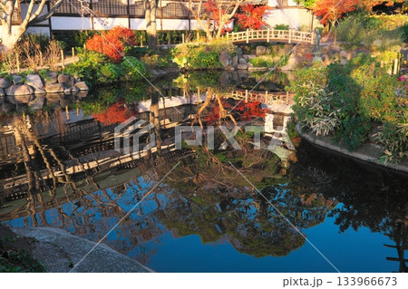 秋の遊行寺 西日に照らされた太鼓堂を映す放生池