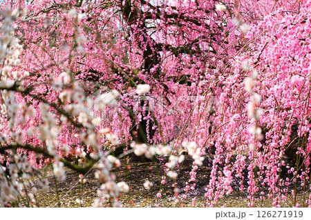ピンク色のしだれ梅 「藤牡丹枝垂れ」