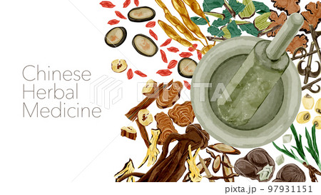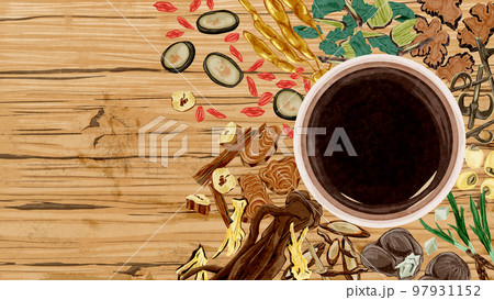 テーブルに並べられた漢方生薬手書き水彩風イラスト
