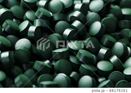 Green tablets of vitamins from spirulina as a textural background in full screen.