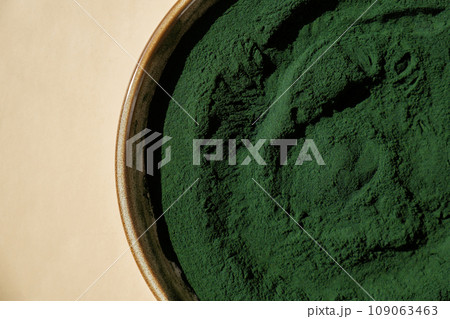 Natural organic green spirulina algae powder in bowl on neutral background. Chlorella seaweed vegan superfood supplement source and detox. Copy space Healthy nutritional antioxidant