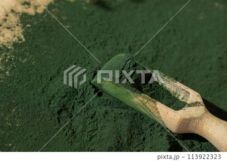 Organic blue-green algae spirulina powder food in wooden spoon. Copy space for your text Health benefits of spirulina chlorella. Vitamins and minerals to diet. Detox dietary supplement Seaweed
