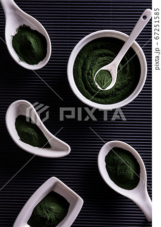 Organic blue-green algae spirulina powder food in plate. Copy space for your text Health benefits of spirulina chlorella. Vitamins and minerals to diet. Detox dietary supplement Seaweed superfood