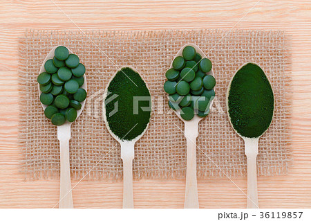 superfood, seaweed, spirulina and chlorella pills and powder in wooden spoons with frame, healthy