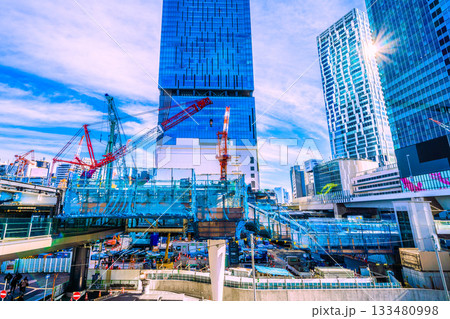 日本の東京都市景観11月24日。流れる雲や光芒…クローラークレーン…鉄骨で奥が見えなくなった=渋谷