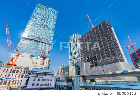 日本の東京都市景観 渋谷駅やクレーン、ビル群。画面中央奥に六本木ヒルズや麻布台ヒルズなどが見える