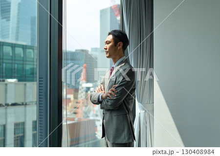 外を眺める男性