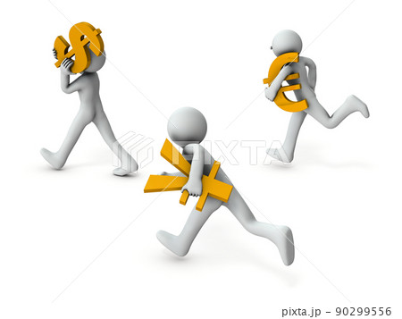 ドル、円、ユーロ記号を抱えて走る。世界経済の覇権を争う各陣営。
