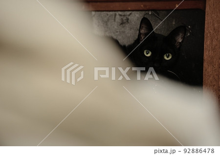 物蔭からそっと見つめる我が家の黒猫の姿