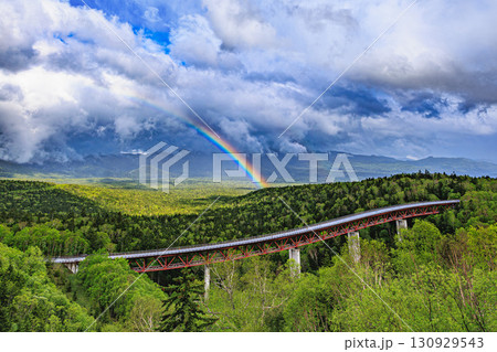 オホーツク海にかかる鮮やかな虹と波打ち際