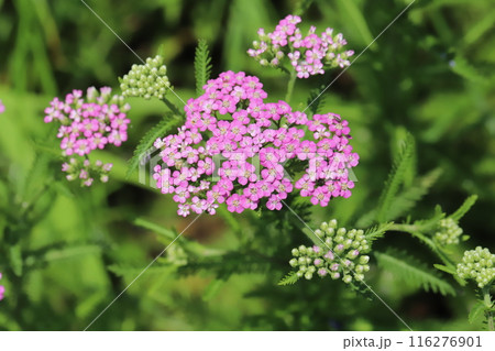 初夏の日本の公園に咲くピンク色のノコギリソウの花