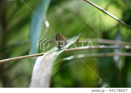 金色の環がついた蛇の目模様が特徴のヒメウラナミジャノメ