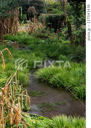 緑豊かな水草の間を縫って蛇行する穏やかな小川の風景