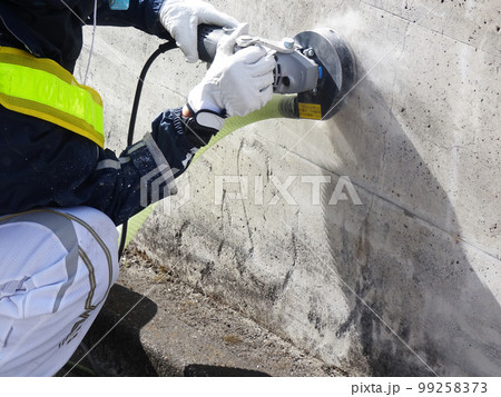 集塵サンダーでコンクリート表面の素地調整をしている様子