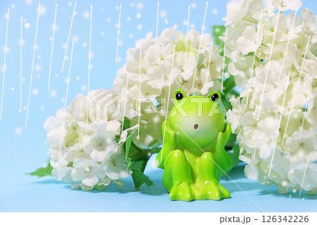 かわいいカエルの置物と白い紫陽花に降る雨 梅雨のイメージ背景