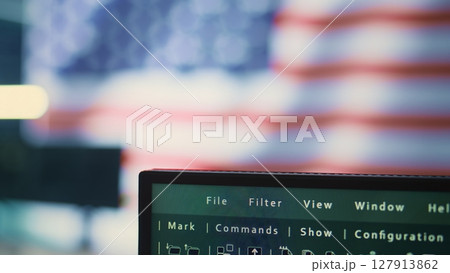 Empty high tech office with a big screen showing an American flag, representing cybersecurity operations. Encryption, malware detection and security protocols to ensure data security. Camera B.