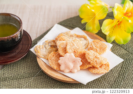 Japanese prawn crackers isolated on black background, traditional Asian restaurant snack, full depth of field