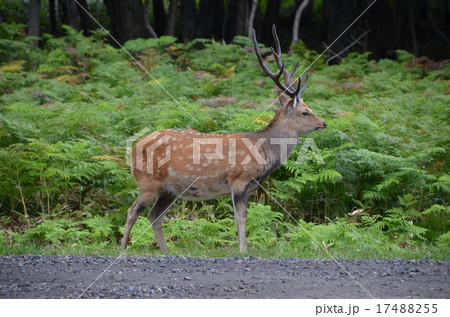 野生のエゾ鹿のオス 大きい角 北海道の大自然