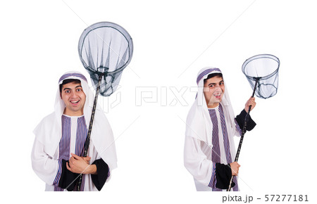 Arab businessman with catching net on white