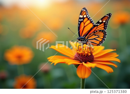 A stunning close-up photograph of a vibrant orange Monarch butterfly perched on a bright yellow-orange flower, likely a marigold or black-eyed Susan. The butterfly's wings are spread.