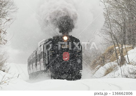 釧網本線 塘路ー萱沼 雪降り 驀進する蒸気機関車