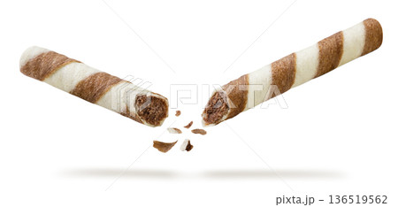 Wafer roll broken in half flies close-up on a white background. Isolated