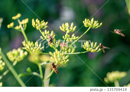 A group of insects on a flowering plant in soft natural light. Slender stems and delicate inflorescences. Macro photography of striped insects on the plant's green inflorescences.