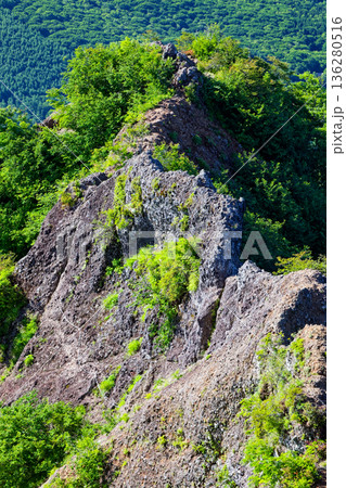 戸隠山への登りから見る蟻の塔渡りの岩峰と鏡池