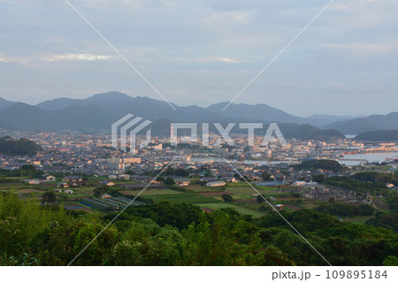 長崎県五島市の大津展望台付近からの朝日と市内の朝景色