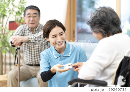 介護施設で血中酸素飽和濃度を測ってもらうシニア