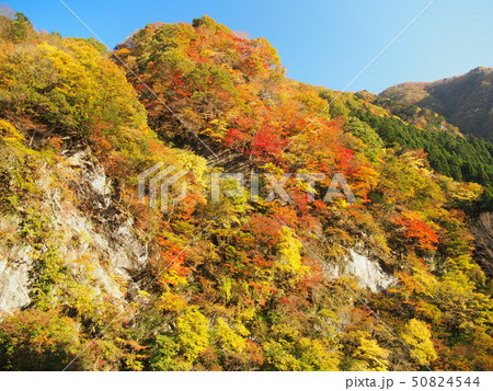 埼玉県秩父市大滝 奥秩父荒川支流の紅葉の名所大血川渓谷の紅葉もみじと山の景色