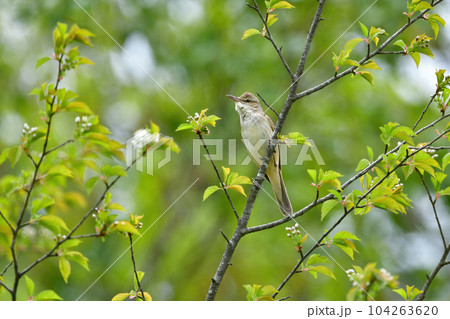 高いところの小枝につかまりさえずっているオオヨシキリ