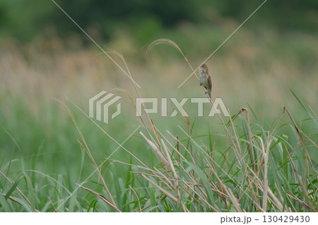 仙台市の大沼に自生する葦につかまっているオオヨシキリ