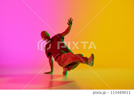 Dynamic photo of young, stylish dressed man performing in neon light against gradient pink-yellow background.