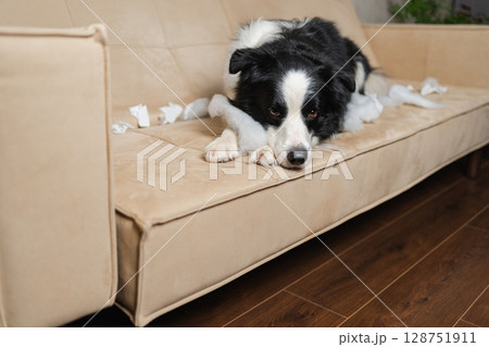 Naughty playful puppy dog border collie after mischief biting paper lying on couch at home. Guilty dog and destroyed living room. Damage messy home and puppy with funny guilty look