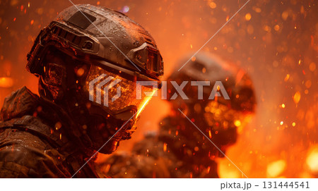 Futuristic soldier helmet armor fire sparks intense science fiction battle glowing visor dramatic