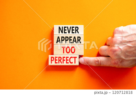 Never appear too perfect symbol. Concept words Never appear too perfect on beautiful wooden blocks. Beautiful orange table orange background. Business and never appear too perfect concept. Copy space.