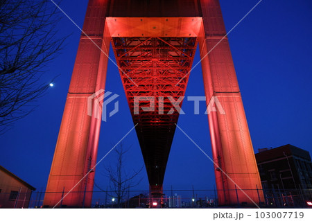夕暮れ時に見上げる赤い吊り橋の若戸大橋