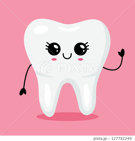 Cartoon groovy tooth medicine and health character smiling and waving, conveying a sense of friendliness with expressive eyes, spark and retro shoes, emphasizing dental hygiene and oral care for kids