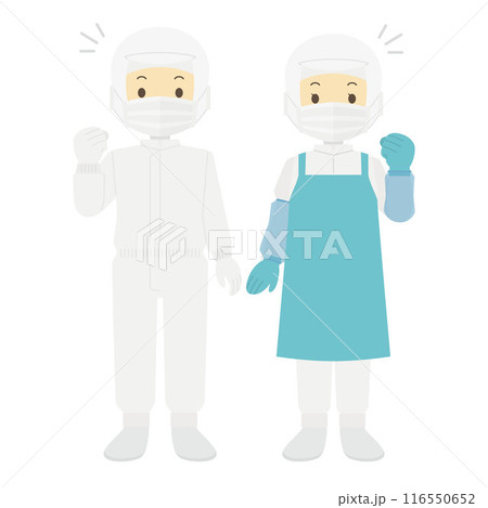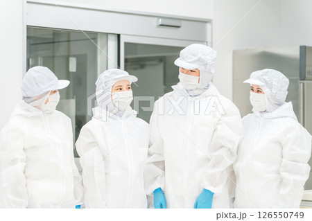 防護服,クリーンウェアを着る製造工場で働くスタッフの男女