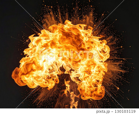 黒い背景の暗闇に燃え上がる火の粉が舞い散る炎の爆発の瞬間