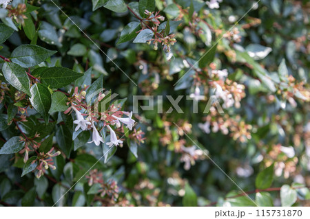初夏の庭に咲く白いアベリア(ハナツクバネウツギ)の花