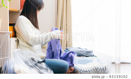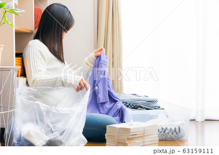 服を整理する女性 断捨離 リサイクル 衣替え 16:9