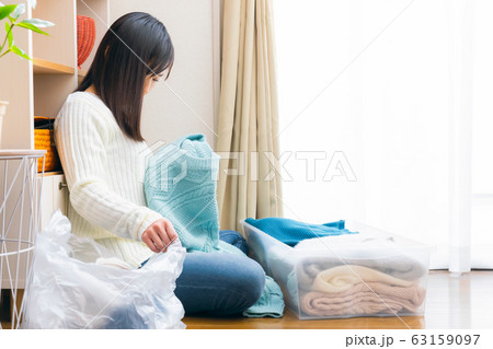 服を捨てる女性 断捨離 リサイクル 衣替え