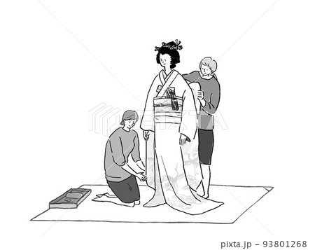 花嫁の着付けをする2人の女性、白無垢、花嫁衣装、モノトーン(衣裳敷あり)
