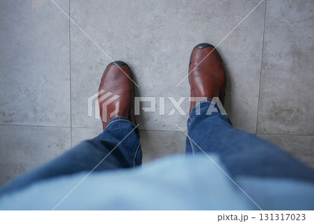 Brown shoes and blue jeans on tiled floor in a cozy setting