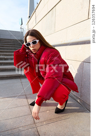 High fashion photo of a young brunette woman in red glossy down jacket, and red pants. Urban street fashion.